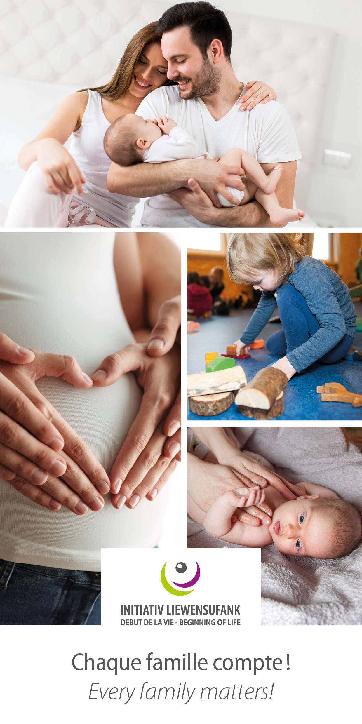 L’Initiativ Liewensufank accompagne les futurs et jeunes parents pendant la période extraordinaire où ils fondent une famille en leur offrant des informations et des consultations compétentes ainsi que des cours et groupes. Dans un cadre chaleureux et accueillant, femmes et hommes peuvent se réunir avant ou après l’accouchement pour des cours ou au sein de différents groupes pour partager les changements, les espérances, les craintes et les joies de cette étape particulière de leur vie.